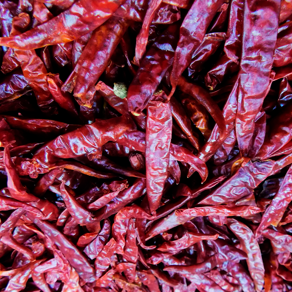 Chile Cambray No Picoso. Variedad de chile seco que aporta un color rojo vibrante y un ligero sabor afrutado. Ideal para dar base de color y aroma a caldos, guisos y adobos sin añadir picor.