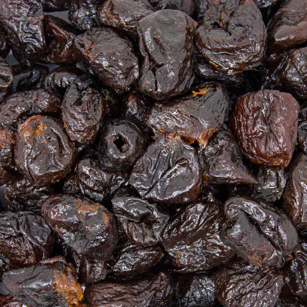 Ciruela Pasa. Ciruela deshidratada, de color marrón muy oscuro (casi negro), textura suave y carnosa, y sabor muy dulce. Rica en fibra y sorbitol, es mundialmente conocida por su efecto laxante natural. Se consume sola como snack, o se utiliza en repostería y platos salados (rellenos para carnes, compotas).