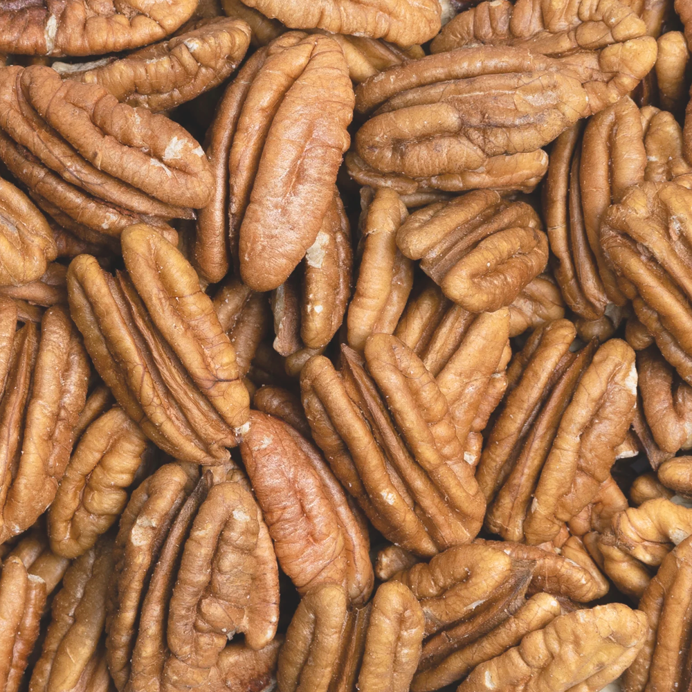 Corazón de Nuez. Nombre común para las mitades de la nuez pecana (pecan halves). Se caracteriza por su forma de corazón o cerebro, su color marrón claro, su textura crujiente y su sabor distintivamente dulce y mantecoso. Es rica en grasas saludables (Omega-3), antioxidantes y Magnesio. Uso principal: repostería (tartas y pies), snack, ensaladas y para elaborar mantequillas de frutos secos.