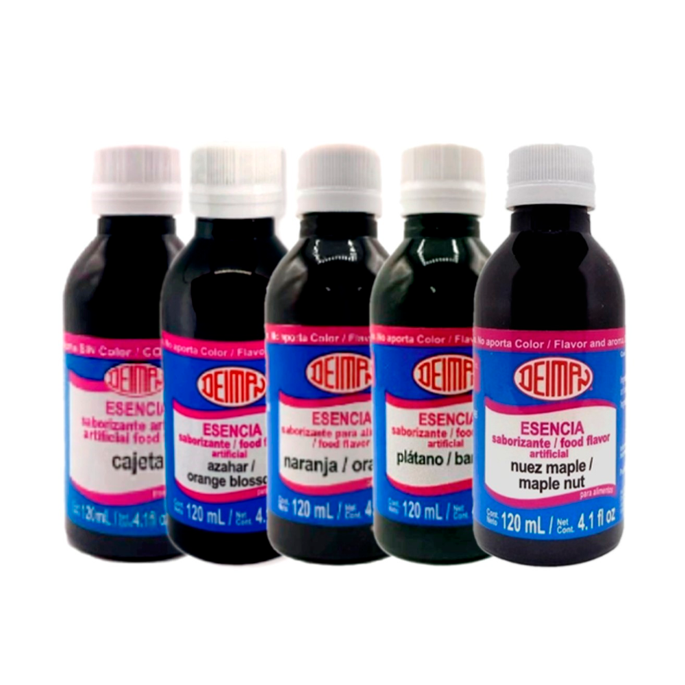 Esencias de Sabores Deiman. Línea de saborizantes líquidos concentrados a base de agua que imparten sabor y aroma (sin color). Ideales para repostería, panificación, bebidas (bolis, gelatinas) y dulces. Permiten estandarizar sabores y reducir costos.